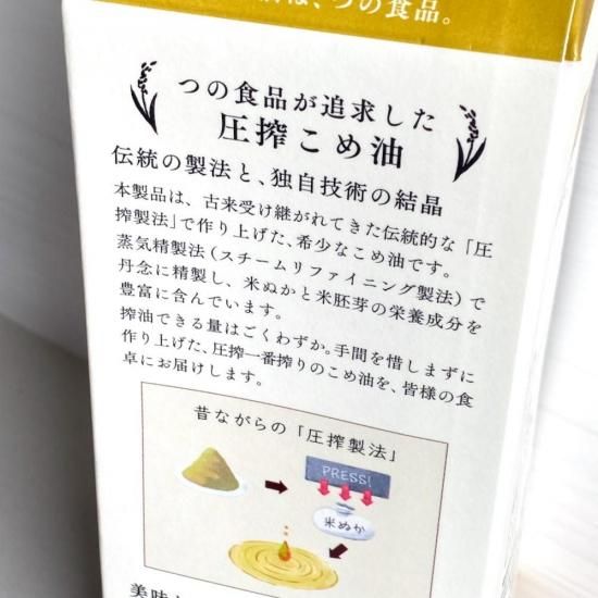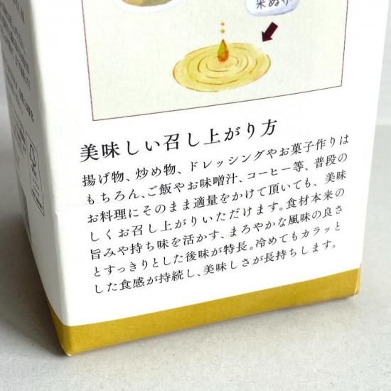 米ぬかから製品になるまで完全無溶剤でつくったこだわりの圧搾こめ油です。