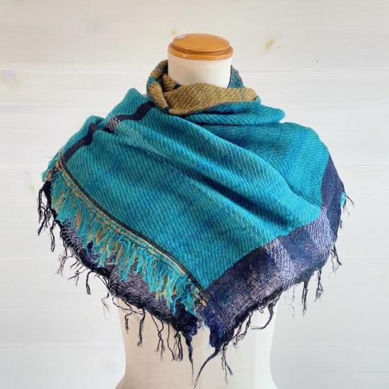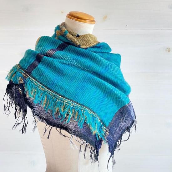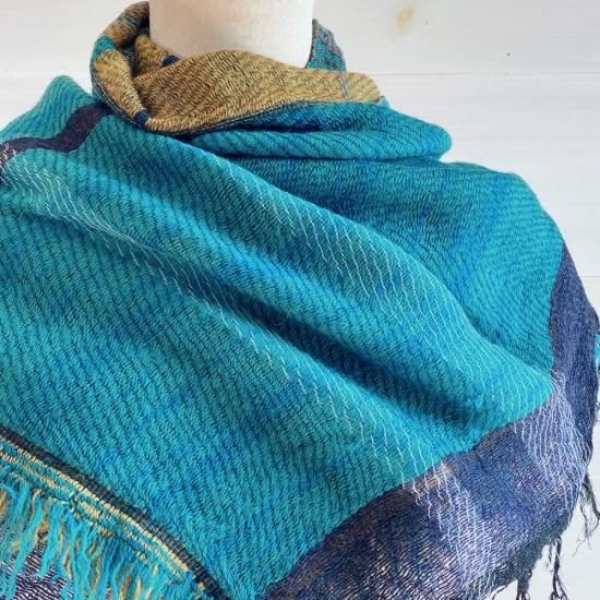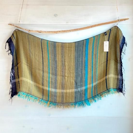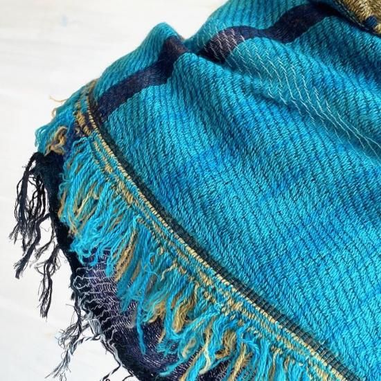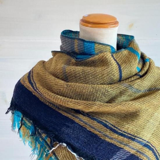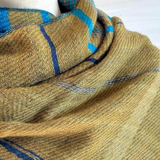 ショールというと大きく包み込む大判のことを指すのかもしれませんが、こちらはショールの「SMALL」ということで、2回首にクルクルと巻き付けてギリギリ結べるくらいの、大きさ。マフラーに近いかもしれない、ネックウェアとして使っていただくのにぴったりのサイズです。ゆるく、ゆったりと織り上げた細いウールの糸はふんわりしていてとても軽く、柔らかく、ちくちくもしない(これは個人差があるかもしれませんが、かなりちくちくしない分類に入ると思います)ウールのショールです。
