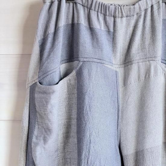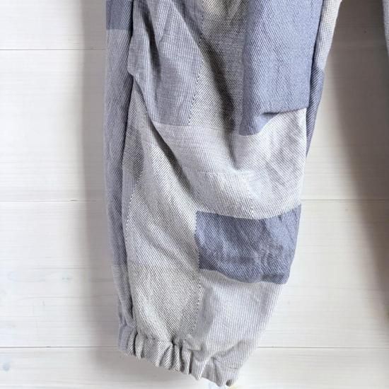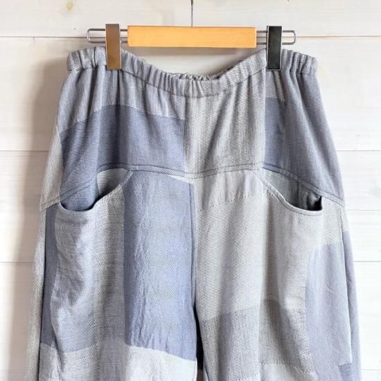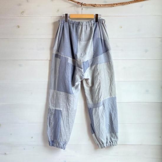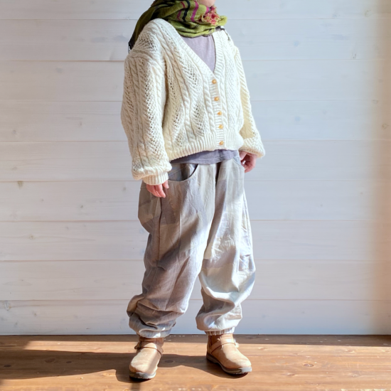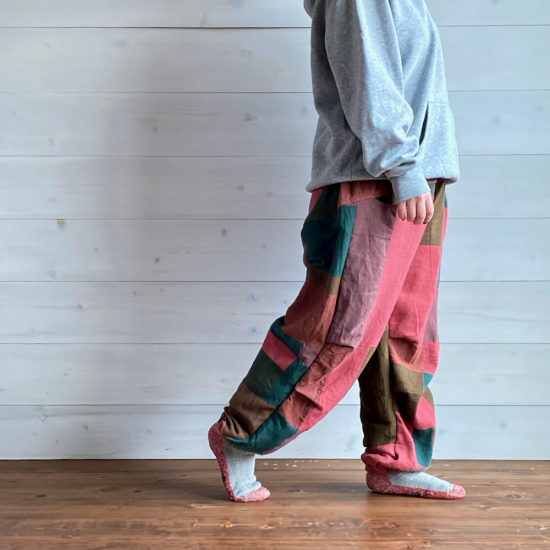 nica pants hoso=デザインの着想はニッカポッカ!ユニセックスで履けるパンツです。裾がゴムでキュッとしまっているので、たっぷりの布を使っているのに足捌きが良く動きやすいアクティブに動けるパンツです。モデル着用写真ご参照くださればわかるかと思いますが、モデル151cmには裾がたくさん余るほどですが、そのまま履けますし、身長の高い方でも履いていただけるパンツとなっています。