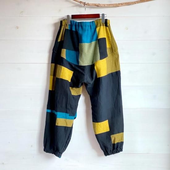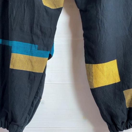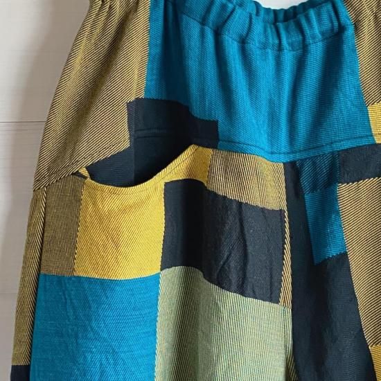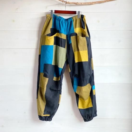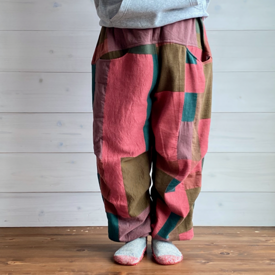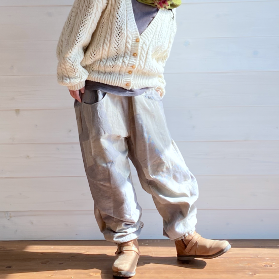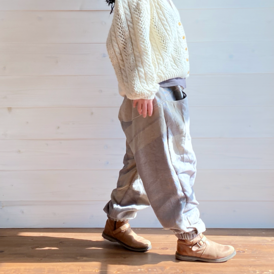 nica pants hoso=デザインの着想はニッカポッカ!ユニセックスで履けるパンツです。裾がゴムでキュッとしまっているので、たっぷりの布を使っているのに足捌きが良く動きやすいアクティブに動けるパンツです。モデル着用写真ご参照くださればわかるかと思いますが、モデル151cmには裾がたくさん余るほどですが、そのまま履けますし、身長の高い方でも履いていただけるパンツとなっています。